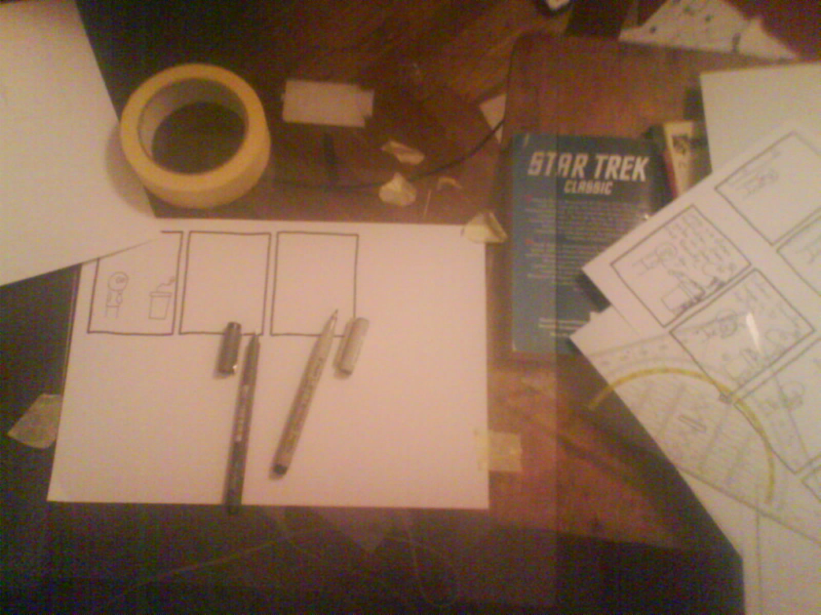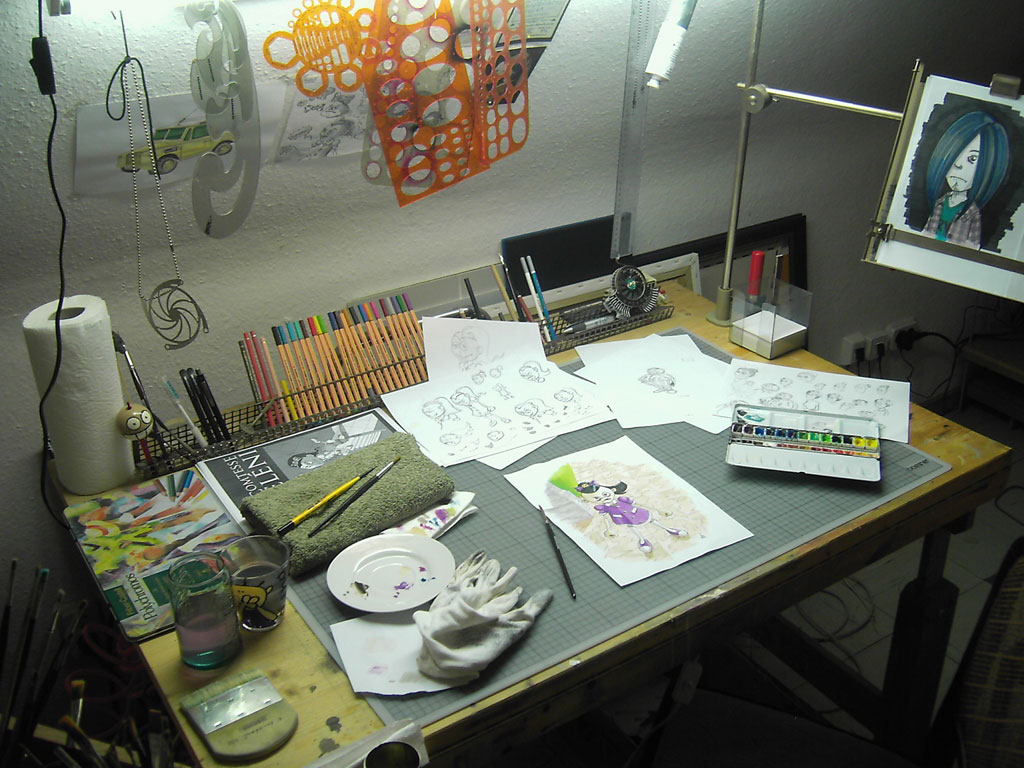 Mein Zeichentisch. Nicht zu sehen: der Leuchttisch unter der Matte, alles Eigenbau. Die Platte kann man auch aufstellen, aber das fällt meistens wegen Chaos aus. Von oben beleuchtet mit zwei 36W-Tageslichtleuchtstofflampen.