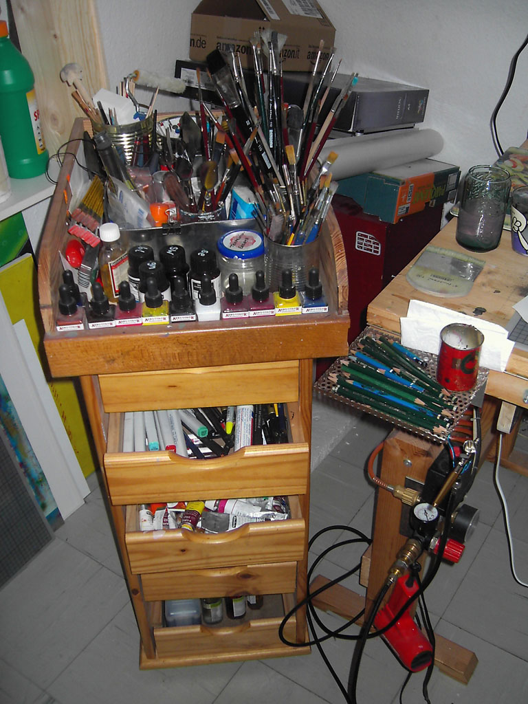Und zu guter Letzt: Aller Krams sinnvoll zentral gelagert im Sperrmüllmöbel, kann ich nur empfehlen. In der versteckt zu sehenden roten Kiste wohnt der Kompressor schallgedämmt.