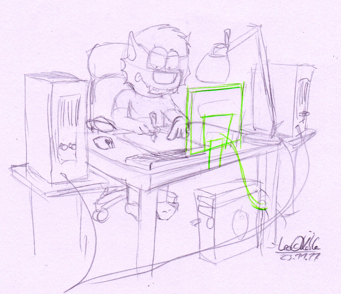 Der Elektromarkt. Inclusive Dummy meines aktuellen Objektes der Begierde. Da muß wohl eine größere Arbeitsplatte her. Auf dem Bildschirm: Erste Gehversuche mit meinem brandneuen Sketchbook Pro 2011. Erst gestern bekommen, aber schon für gut befunden. Besonders die Copic-Funktion ist Kanone, sieht aus wie echt. Und kost' nur 59 Euro.
