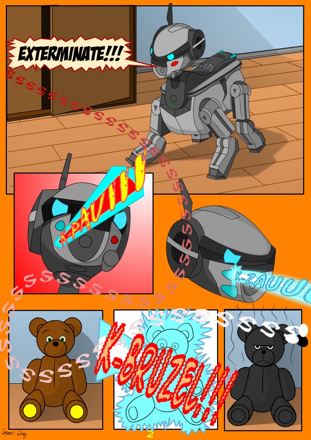 Was mir weniger gut gefällt ist die Art, wie du die Laserstrahlen des Hundes zeichnest. Vielleicht würdest du eine noch interessantere Wirkung erzielen, wenn du Hund und Teddy in ein einziges Panel bekommst. Grundsätzlich würde ich dir raten, viel zu experimentieren und dir anzusehen, wie andere Zeichner aus dem Genre in das du gehen willst technisch ihre Comics umsetzen. Ein wenig analysieren, sozusagen.