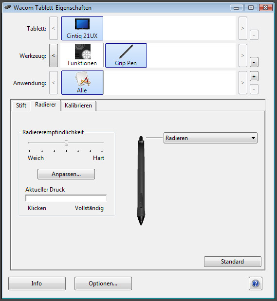 Dein Cintiq24 hat ja auch intuos4-Technik drin, gell? Mein Grip Pen weigert sich standhaft zu radieren, hast Du das schon mal gehabt? Die Treibervoreinstellungen habe ich schon komplett zurückgesetzt und es ist auch brav "Radieren" in den Tablett-Eigenschaften eingestellt. Von Wacom kommen auch nur Quatschvorschläge.