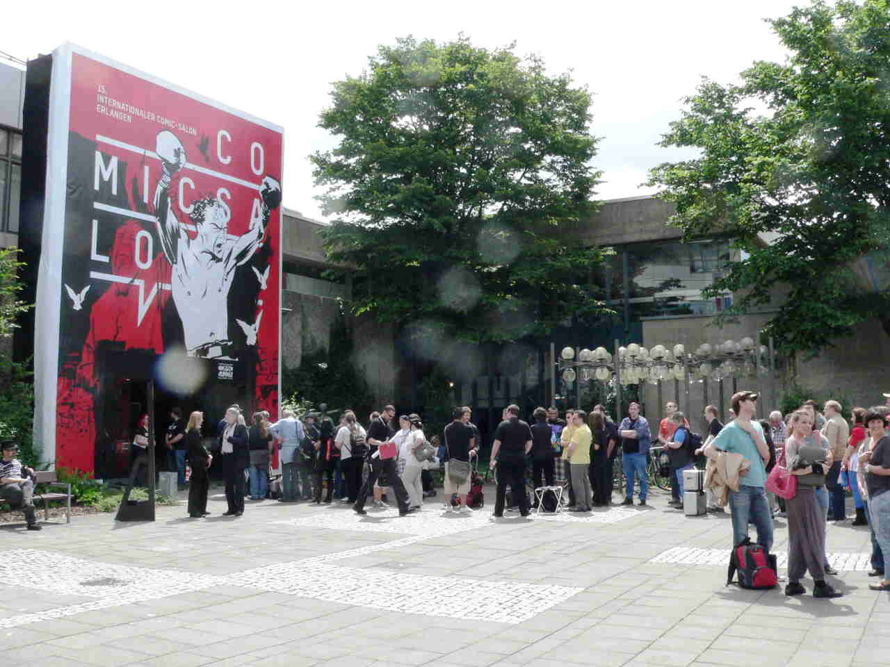 Heute ging’s los – pünktlich um 12 Uhr. Wenn der Comic Salon in der Erlanger Kongreßhalle (Bild eins zeigt das Veranstaltungsplakat) öffnet, hat sich gewöhnlich schon eine lange Schlange von Fans vor dem Haupteingang gebildet (wie auf meinem zweiten Foto zu sehen). Im Inneren finden sie die Messe mit 150 (großen und kleinen) Verlagen, eine Comicbörse, einen Teil der Ausstellungen und Veranstaltungen wie Lesungen, Podiumsdiskussionen oder Künstlergespräche.