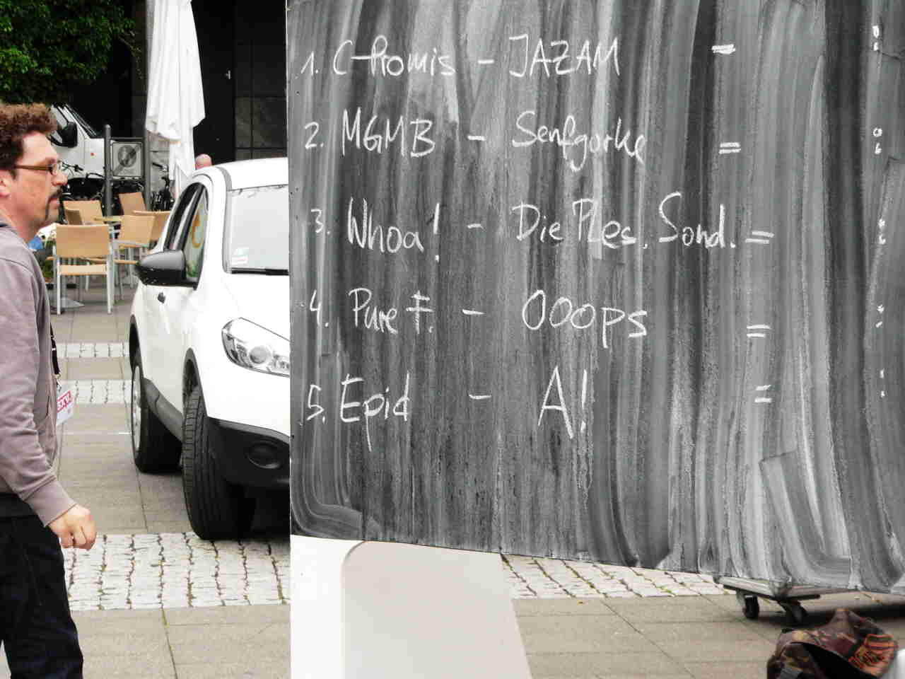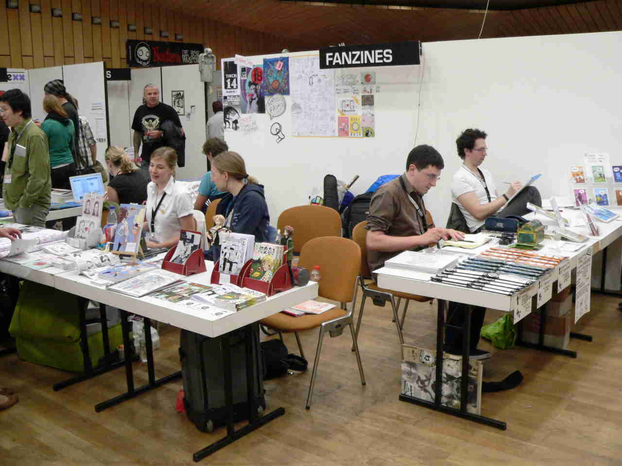 Mit der Befragung der Fanzine-Macher bin ich noch nicht fertig. Es scheint aber wie früher zu sein: Ein Teil produziert Anthologien, also Storysammlungen, bei denen auch neue Zeichner eine Chance haben, ein anderer veröffentlicht nur seine eigenen Comics. Daß es noch immer etliche gedruckte Fanzines gibt, zeigte der ComicClash (Fotos zwei bis vier): 20 Magazine mit insgesamt 240 Zeichnern treten gegeneinander an und wollen das beste Team küren (die Wettbewerbe laufen zur Stunde noch). Man sieht hier, wie Kandidaten mit einem etwas zu groß geratenen Filzstift in jeweils 30 Sekunden Figuren wie Max und Moritz oder Wickie zeichnen müssen – also diese Battles sind nicht ganz ernst gemeint. Mehr dazu demnächst. Aber die 20 Fanzines gibt es wirklich.