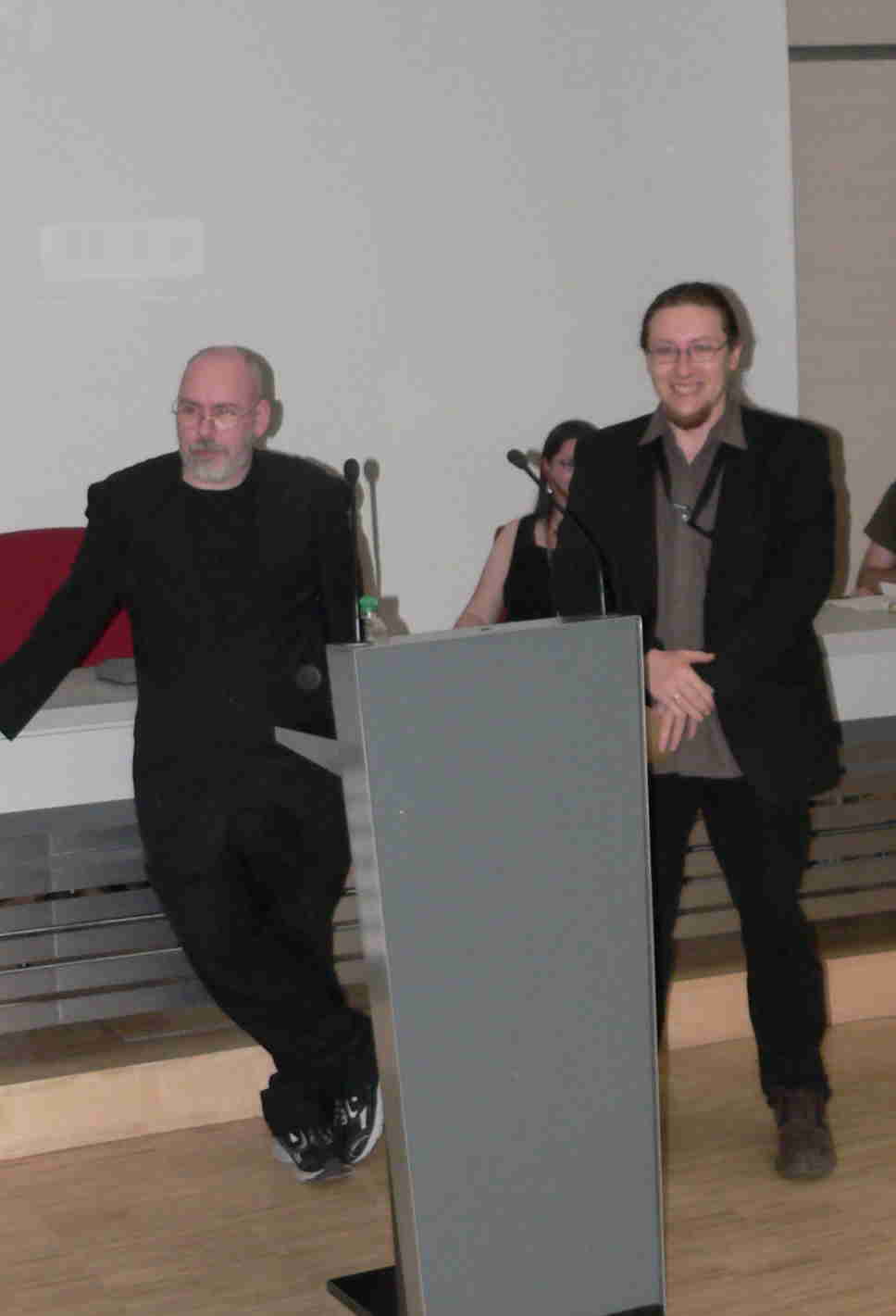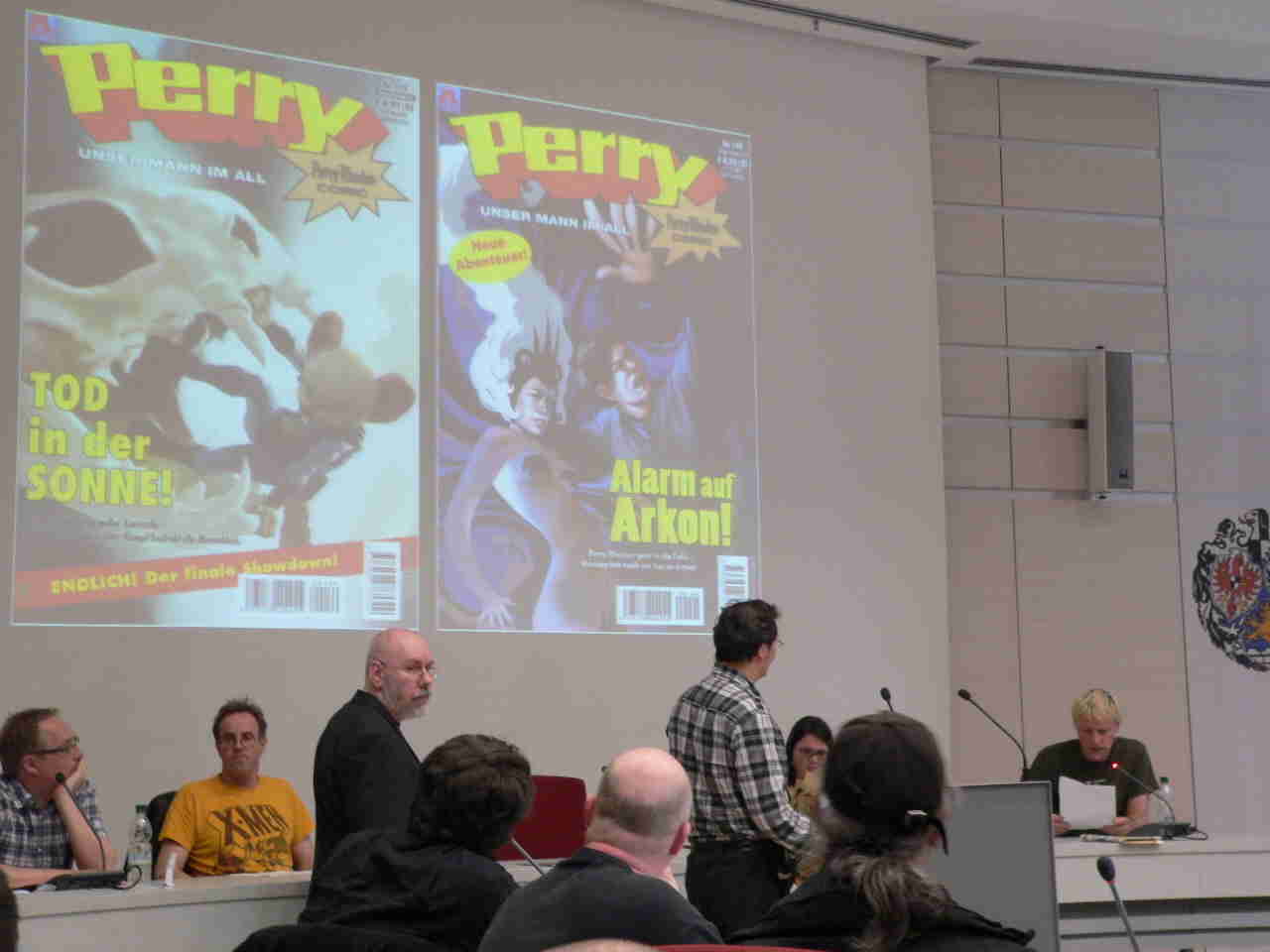 Die Fotos neun und zehn entstanden bei der ICOM-Preisverleihung heute abend. Das erstere Bild zeigt Burkhard Ihme (links) mit Preisträger Levin Kurio. Er hat als Fanzinemacher begonnen und gibt heute ein Gruselmagazin heraus, das Ihr vielleicht auch schon mal am Bahnhofskiosk gesehen habt, „Horror Schocker“. Die Storys werden ausschließlich von deutschsprachigen Zeichnern umgesetzt. Außerdem wurde das Magazin „Perry“ ausgezeichnet, ursprünglich ein Comicheft aus den 70er Jahren. Das Besondere ist, dass es heute von einem Comicstudio in Hamburg produziert wird, der Alligator Farm. Beide Preisträger zeigen, dass Comiczeichner in Deutschland den Weg bis zum Profi schaffen können.