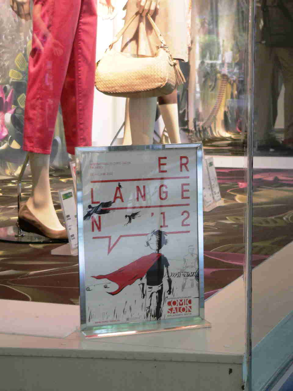 Bild sieben zeigt ein Schaufenster eines Modegeschäfts. Früher waren viele Schaufenster in Erlangen während des Salons zum Thema Comics dekoriert. Das gibt es heute fast nicht mehr – vermutlich aus Kostengründen. Dafür habe ich etwas anderes entdeckt. Erlanger Schüler haben unter dem Motto „Schüler Stadt Comic“ Schaufenster leerstehender Geschäfte und kahle Häuserfassaden comicartig gestaltet (siehe Bild acht). Es entstand ein richtiger „Comic-Weg“ durch Erlangen.