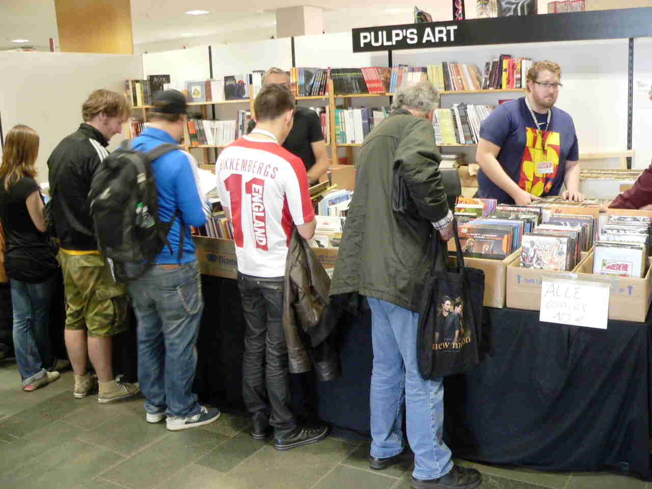 Hier noch ein paar allgemeine Eindrücke vom Salon: Die Messe (Bild sechs), die Comicbörse, auf der Händler antiquarische, aber auch neuwertige Comics verkaufen (Bild sieben). Wichtig beim Salon sind immer Signiertermine von internationalen Zeichnerstars. Ein sehr ungewöhnlicher war der von Helmut Nickel (Bild acht). Der hat nämlich in den frühen 1960er Jahren Comics gezeichnet ("Winnetou", "Robinson", "Der Graf von Monte Christo") und ist heute 87 Jahre alt. Außerdem ist er aus Florida zum Salon angereist, wo er seit vielen Jahren lebt.