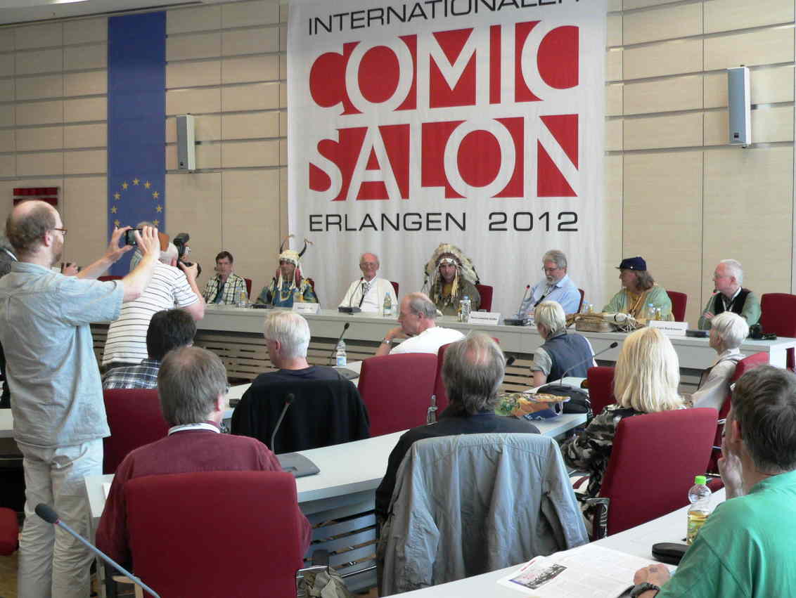 Am Nachmittag habe ich zunächst das Künstlergespräch mit Helmut Nickel besucht (den ich oben bereits erwähnt habe). Es fand im gleichen Saal wie die ICOM-Preisverleihung statt, und Nickel („Winnetou“-Zeichner der frühen 1960er Jahre) war von Mitgliedern des Nürnberger Vereins „Trapper und Indianerfreunde“ eingerahmt, die das Leben der amerikanischen Ureinwohner so naturgetreu wie möglich nachvollziehen wollen (Bild vier). Nickel hat seine Comics teilweise in den USA gezeichnet und von seinem Verleger Walter Lehning nach eigener Aussage manchmal weder Honorar noch Belegexemplare (geschweige denn seine Originale) erhalten. „Ich konnte die Serie nicht komplett nachlesen. Als ich sie jetzt wieder gelesen habe, dachte ich mir: Habe wirklich ich das gemacht? Ich hatte es schon halb vergessen. Die Karl-May-Bücher, die ich als Achtjähriger gelesen habe, hatte ich besser im Kopf.“
