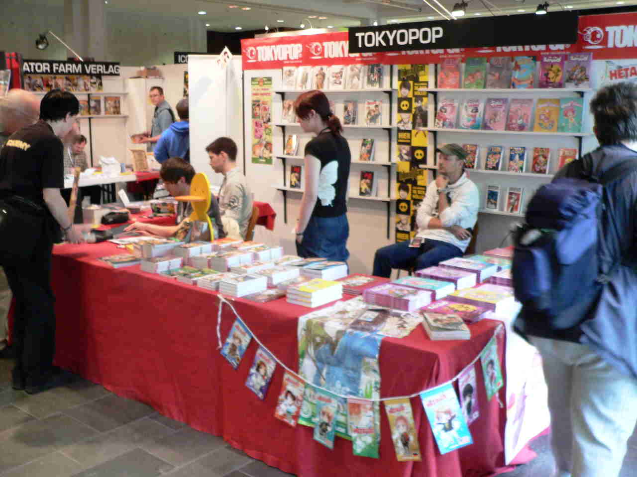 Der letzte Tag des Salons. Am Vormittag bin ich noch mal über die Messe gegangen, das Herzstück des Festivals, wo die Comicverlage sich und ihre Produkte (Alben, Hefte, Bücher und anderes) präsentieren. Damit Ihr davon einen Eindruck bekommt, habe ich einige Stände fotografiert: Ehapa (Bild eins), TokyoPop (Bild zwei), die kleineren Verlage Weissblech Comics (Bild drei) und Gringo Comics (Bild vier) und einen Originalehändler (Bild fünf). TokyoPop war 2010 überhaupt nicht beim Comic Salon und hatte diesmal einen vergleichsweise kleinen Stand, weil es laut dem Verlag für Mangas und Mangafans wichtigere Veranstaltungen gibt. Für Weissblech und Gringo ist der Salon dafür umso wichtiger.