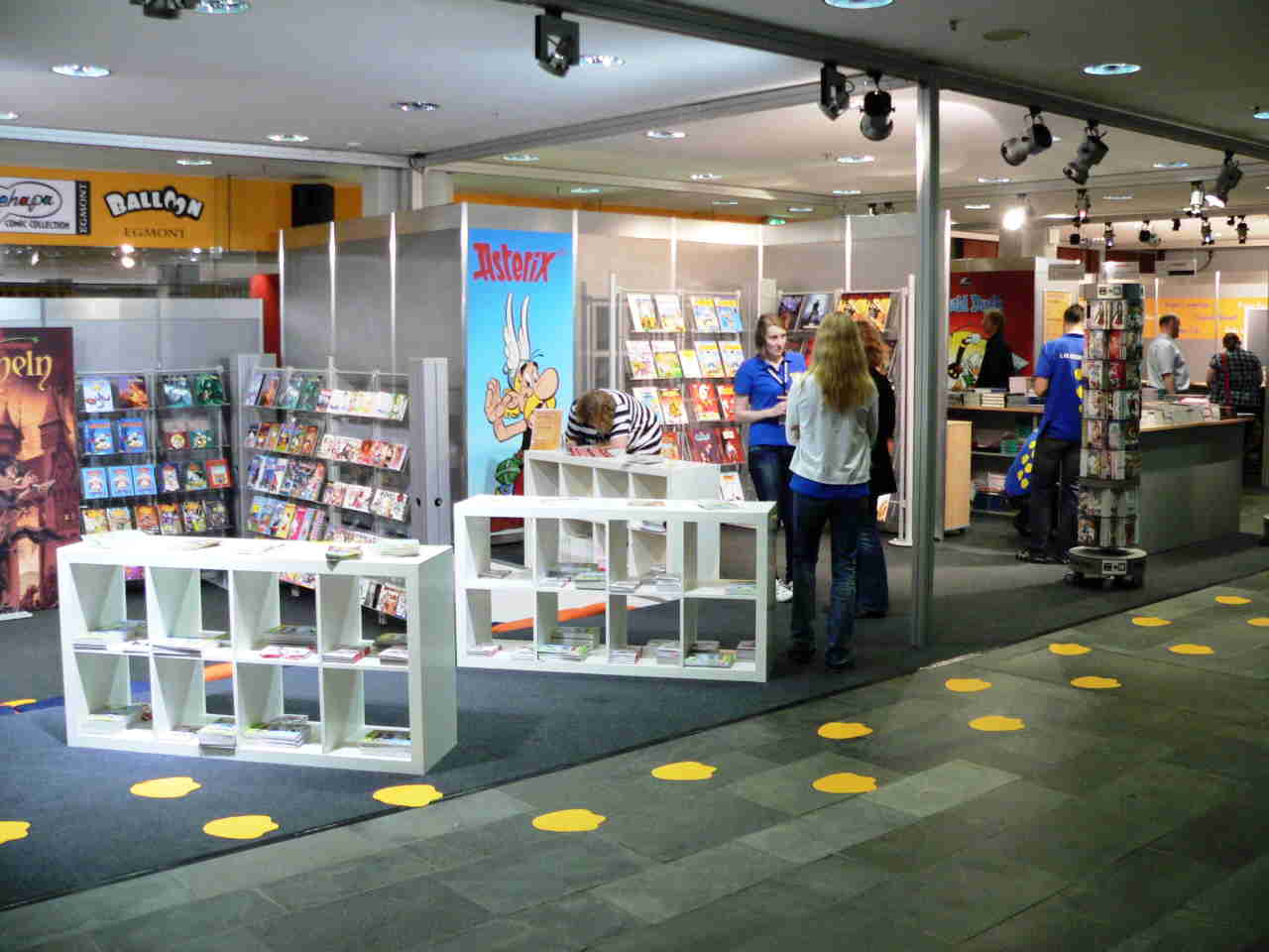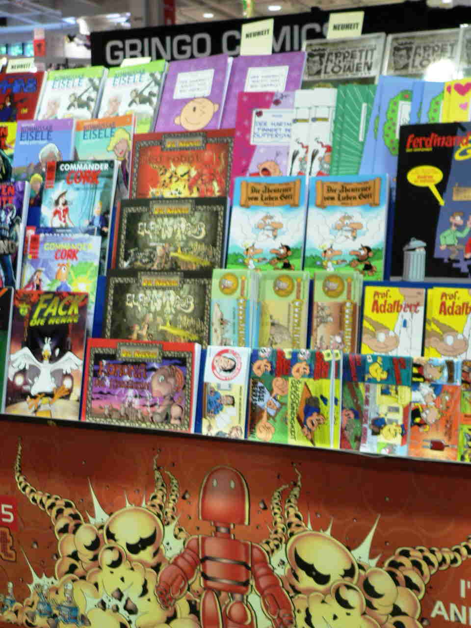 Der letzte Tag des Salons. Am Vormittag bin ich noch mal über die Messe gegangen, das Herzstück des Festivals, wo die Comicverlage sich und ihre Produkte (Alben, Hefte, Bücher und anderes) präsentieren. Damit Ihr davon einen Eindruck bekommt, habe ich einige Stände fotografiert: Ehapa (Bild eins), TokyoPop (Bild zwei), die kleineren Verlage Weissblech Comics (Bild drei) und Gringo Comics (Bild vier) und einen Originalehändler (Bild fünf). TokyoPop war 2010 überhaupt nicht beim Comic Salon und hatte diesmal einen vergleichsweise kleinen Stand, weil es laut dem Verlag für Mangas und Mangafans wichtigere Veranstaltungen gibt. Für Weissblech und Gringo ist der Salon dafür umso wichtiger.