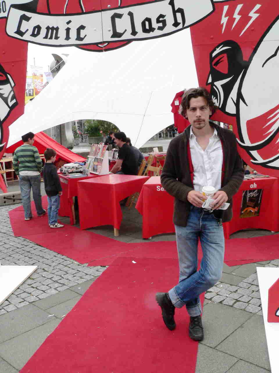Näher habe ich mich heute mit dem ComicClash beschäftigt. Das Projekt, an dem 20 Comicmagazine beteiligt waren und das es so beim Salon noch nie gab, fand in einem Zelt auf dem Platz vor dem Kongreßzentrum statt (Bild sieben). Erklärt hat es mir Mitveranstalter Aha von der Berliner „Epidermophytie“ (Bild acht): Macher dieses Magazins und von „MogaMobo“ (ebenfalls aus Berlin) hatten sich 2011 beim Münchner Comicfest darauf geeinigt, beim Comic Salon nicht nur an ihrem Stand zu sitzen und auf Kundschaft zu warten. Vielmehr sollte ein Wettbewerb veranstaltet werden: Teams aus jeweils mindestens drei Comiczeichnern sollten eine Comicpublikation zum Thema „Der Sinn des Lebens“ produzieren mit mindestens 32 Seiten und 500 Stück Auflage. 24 zum Teil neu entstandene Teams meldeten sich, sechs von ihnen gaben aus unterschiedlichen Gründen vorzeitig auf. Die Beiträge wurden von einer Jury, von Lesern im Internet und von den Teams gegenseitig beurteilt. Außerdem wurde eine Endausscheidung auf einer Bühne auf dem Rathausplatz veranstaltet (darüber habe ich schon berichtet). Aha war zwar von der Organisation des ComicClash sichtlich mitgenommen, kann sich aber nach eigenen Worten vorstellen, so etwas beim nächsten Comic Salon wieder zu machen. Die Resonanz sei „unglaublich positiv“ gewesen, die Stände im Freien, an denen das gesamte Salonpublikum vorbeilief, seien sehr angenehm. Näheres: www.comic-clash.de (hier werden auch alle beteiligten Magazine vorgestellt).