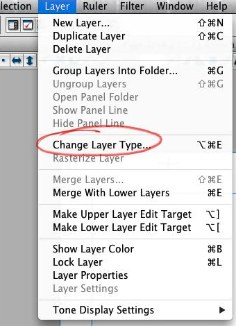 Oben in der Leiste steht Layer, klicke darauf und dann gehst du auf "Change Layer Type ..." (siehe Bild 1)