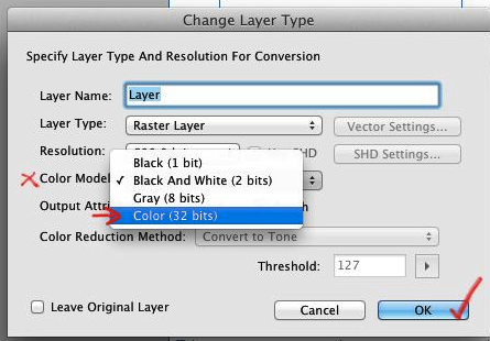 Solltest du da mit mehreren Layern (Ebenen) arbeiten müsstest du jede umstellen, sofern du sie alle in Farbe haben willst.