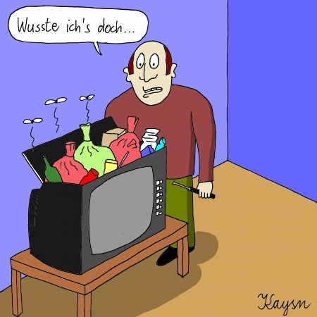 @DMJ: Meinst Du den Text oder die Zeichnung, oder beides? Ich hatte nämlich tatsächlich vorher ne andere Version des Cartoons mit dem Text "Endlich weiß ich warum es immer so viel Müll im Fernsehen gibt".