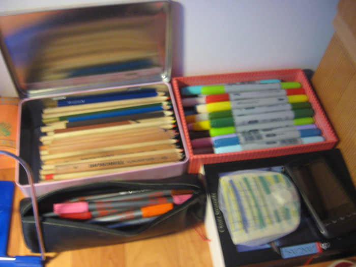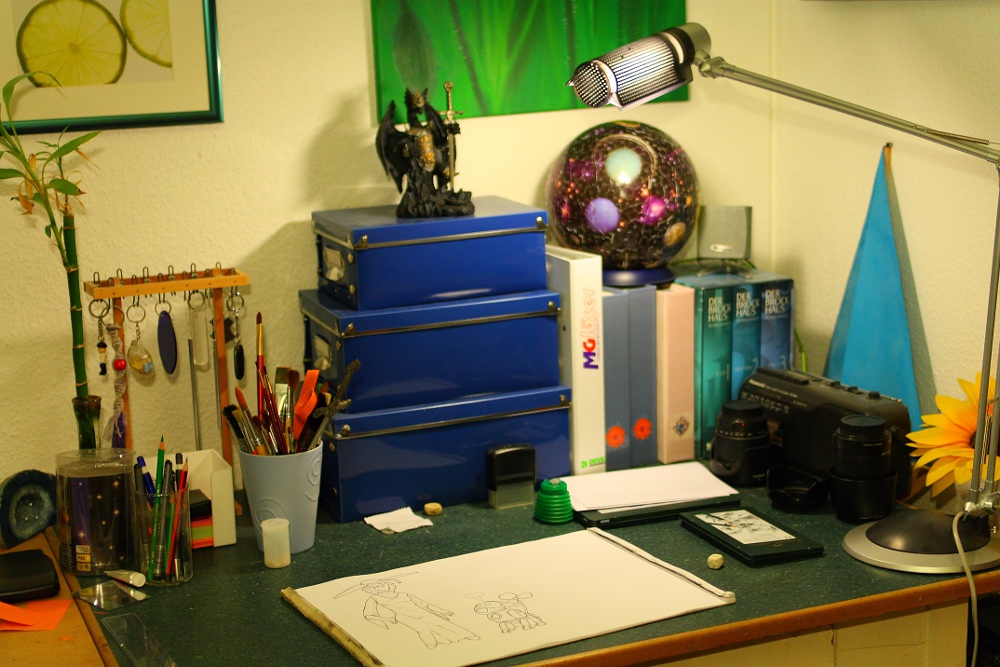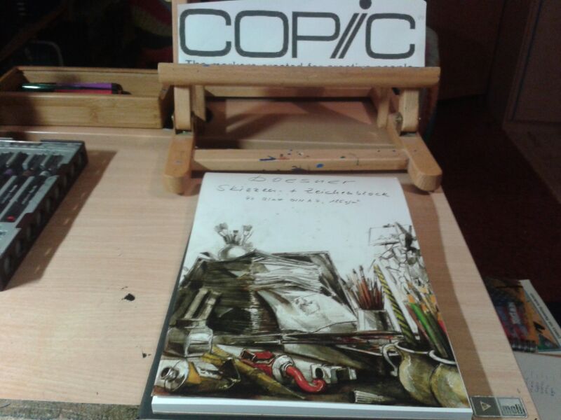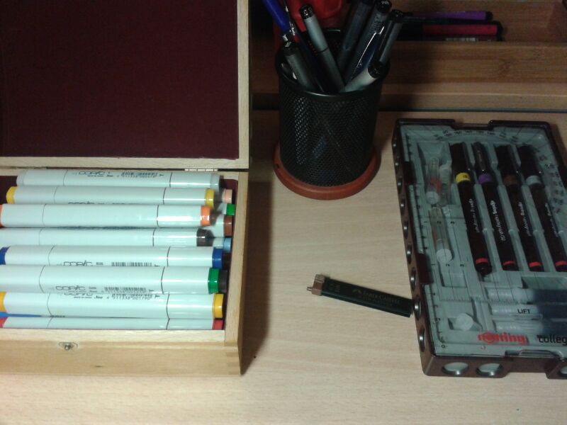 Ich arbeite so gut wie nur "Klassik" und mein schreibtisch sieht dem entsprechend so aus ,mein tablet steht irgendwo drunter da ich es eben so gut wie nie benutze ,meine tusche sieht man gar nicht glaub ich....benutze eh fast nur mit feinliner....ich hab mir nen copic halter bestellt *freu* :D