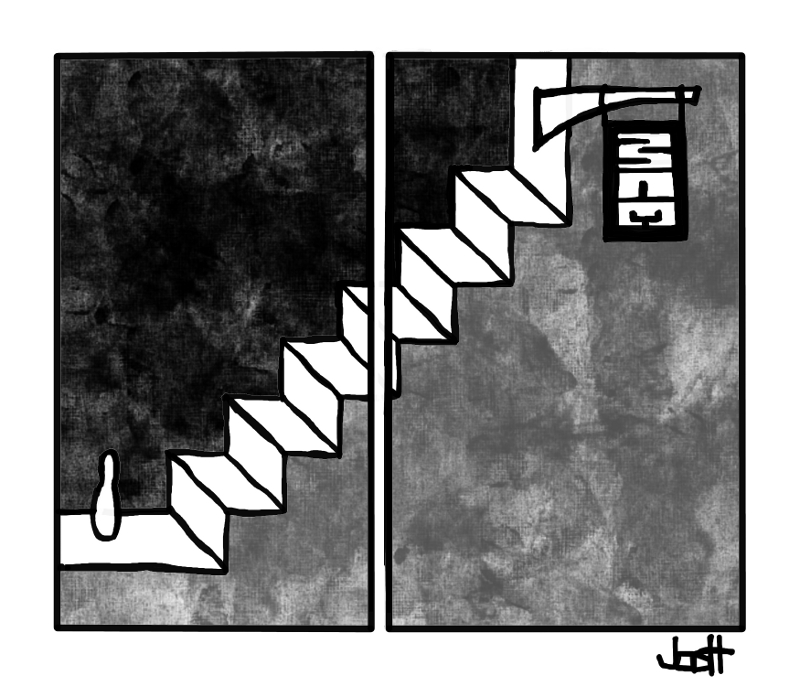 Auf die Wüste kommt man durch die Schweißtropfen. Ansonsten ist das eine Landschaft, die man noch nicht richtig identifizieren kann. Vielleicht wird's noch klar, vielleicht ist das auch einfach die Art von Josh, eine Wüste zu zeichnen.