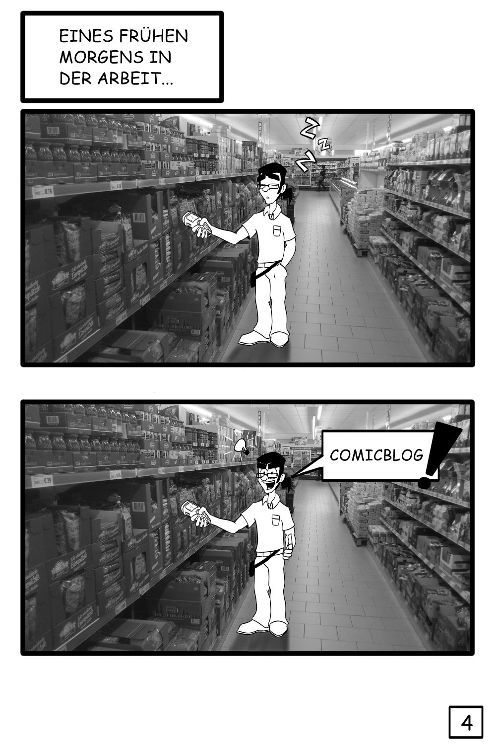 Auch lustig finde ich wie du Fotos und Zeichnungen zusammenfuehrst. Hat auf der ersten Seite allerdings besser funktioniert als auf der vierten, finde ich. Der Schatten passt irgendwie nicht zu deinen klaren Linien und dem supermarktfoto... (Die vierte Seite an sich find ich aber sehr lustig!)