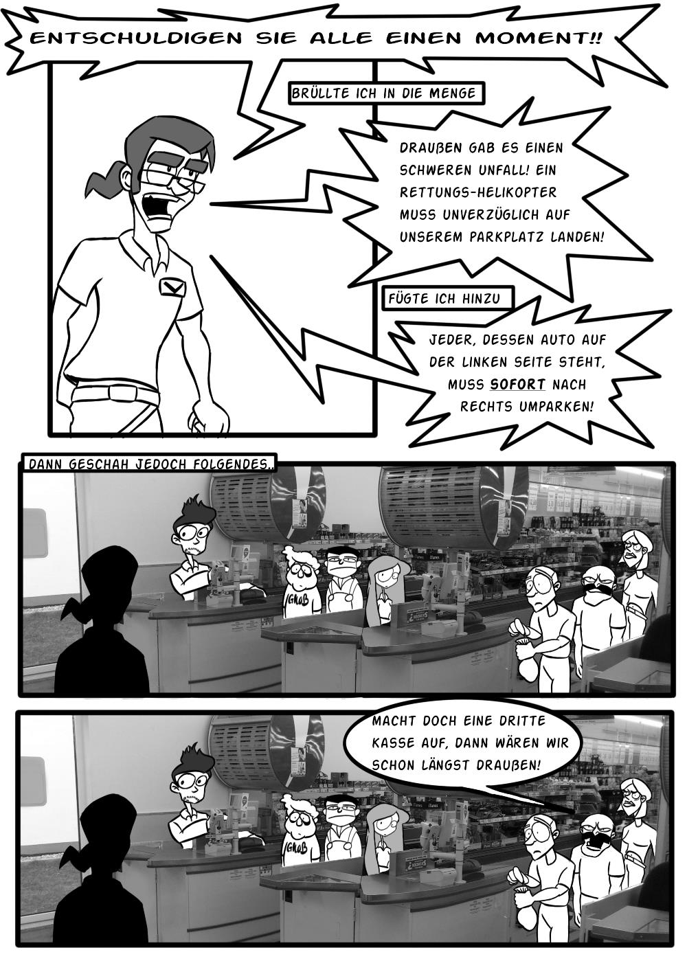 Naja, da steckt aber irgendwie ein Konflikt drin. Erstmal wissen wir ja nicht, wie schwer der Unfall nun war, ob dabei jemand sein Leben verloren hat oder was aus den Verletzten wurde. Die Leute vor der Kasse können eigentlich nicht sofort dort hinrennen, weil sie ja ihre Sachen bezahlen müssen. Sie stehen nicht ganz freiwillig an der Kasse.