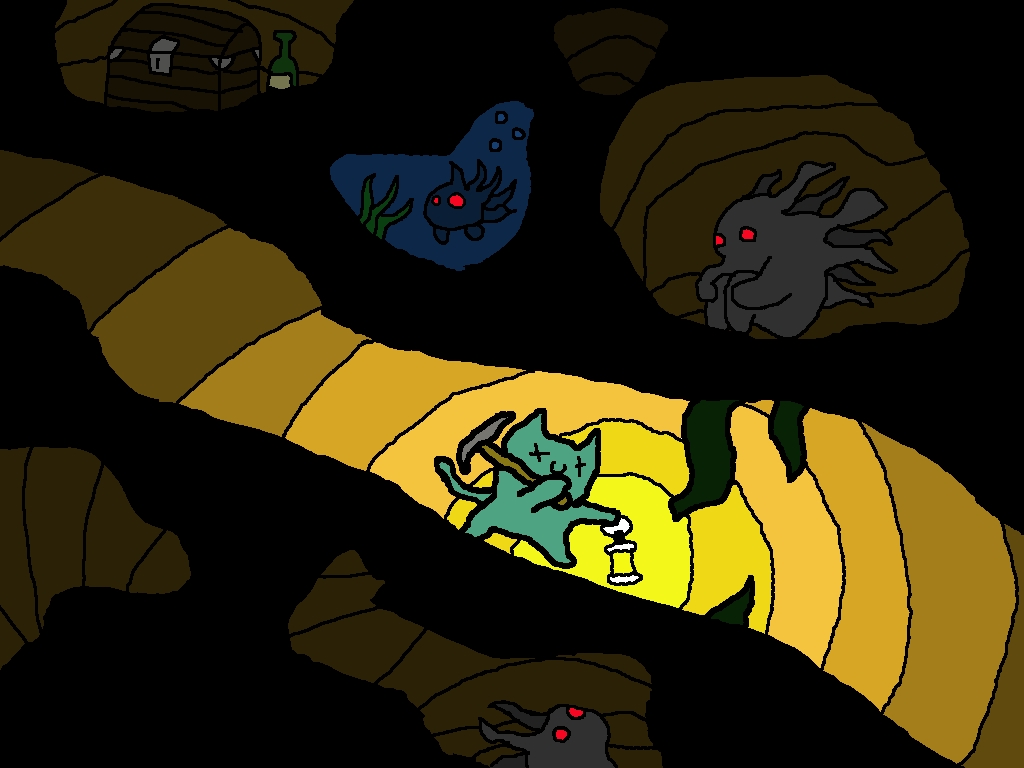 Sehr schöne Idee und wundervoll umgesetzt. Ich mag der Stil und vorallem die hart abgestuften Farbverläufe (besonders der Lichtschein in dem Höhlenbild).