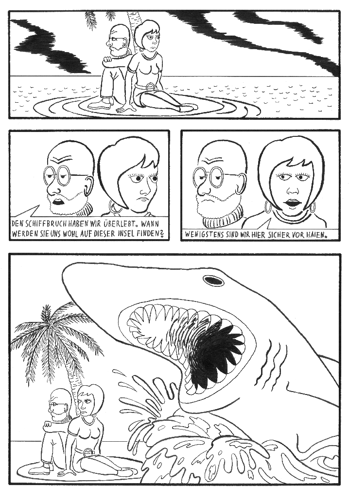 Zeichnerisch bin ich damit noch nicht ganz zufrieden. Immerhin besser als vor 2 Jahren, wo ich nur Strichmännchen konnte. Zur Zeit übe ich intensiv Gesichter; Hände kommen auch irgendwann dran. Übrigens hab ich öfter mal gelesen, das die zeichnerische Qualität nicht so wichtig ist, wenn nur die Story stimmt und spannend ist. Farbige Comics sind mir eigentlich lieber als nur schwarz-weiße. In diesem Fall hab ich mir es gespart nicht aus Faulheit, sondern um es mal in einer Studentenzeitschrift veröffentlichen zu können, die im Duplexdruck erscheint und es mit vielfarbigen Illustrationen bei Repro und Druck Probleme geben dürfte. Da ich guten Zeichenkarton genommen habe, kann ich es ja später immer noch kolorieren. Dafür nehme ich übrigens Tusche von Rohrer.