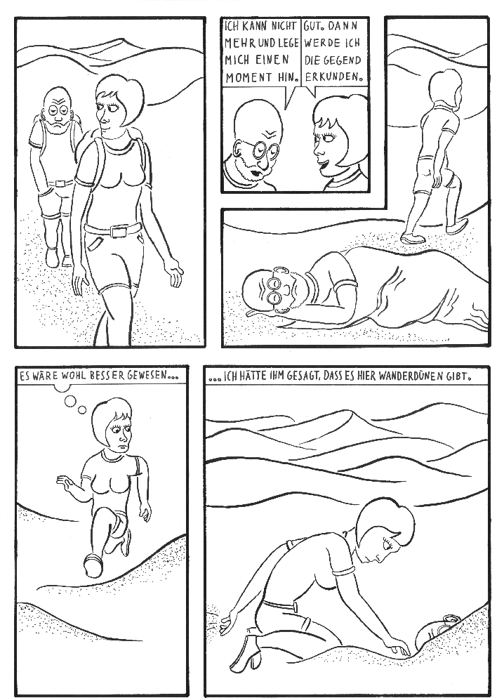 Aha, es geht weiter! Die Comicseiten sind auf jeden Fall klarer und weniger textlastig als bei Yves & Cartesius. Ich glaube, etwas Farbe könnte den neuen Seiten gut tun. Die Pointe der 4. Folge ist klar, dennoch bleiben Fragen offen, z.B.: Was gräbt die gute Liane da im letzten Bild der Wüstenstory aus? Oder vergräbt sie was? :huh: