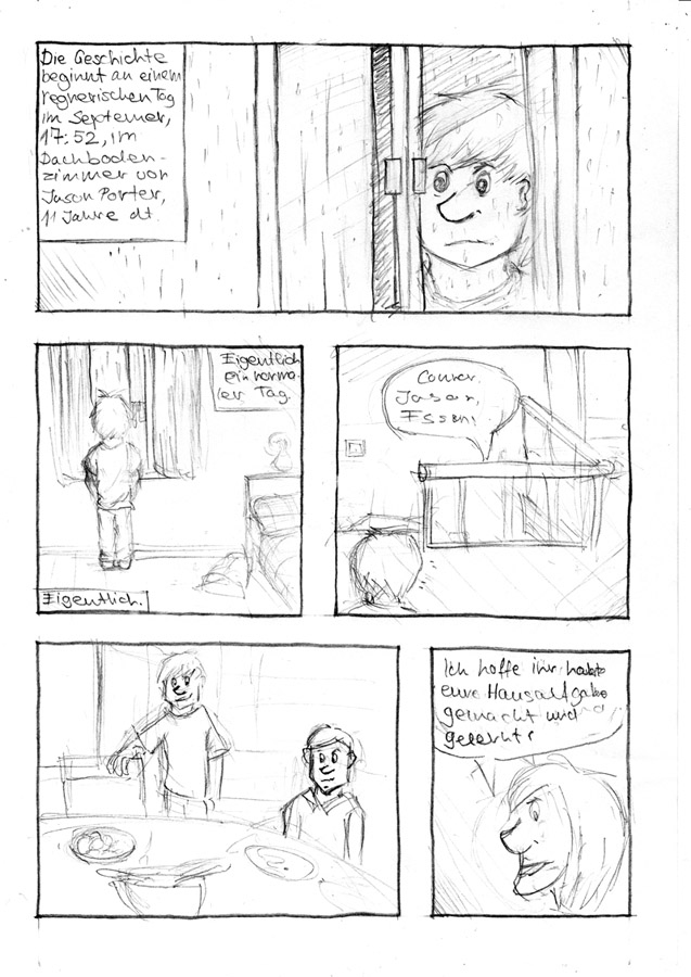 Bis jetzt hab ich schon etwa 3 cm große Skizzen für die ersten 3 Seiten, und habe angefangen die Charakter zu zeichnen :)