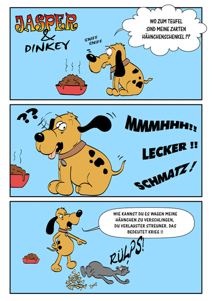 Find ich gut gezeichnet :thumbsup: der Witz im ersten Cartoon kommt bei mir besser an, als im 2. weil Jasper in Wirklichkeit keine Vogelknochen vorgesetzt bekommen würde, weil sie eventuell tödlich für ihn sein könnten. Ansonsten bin Ich gespannt auf mehr! :)