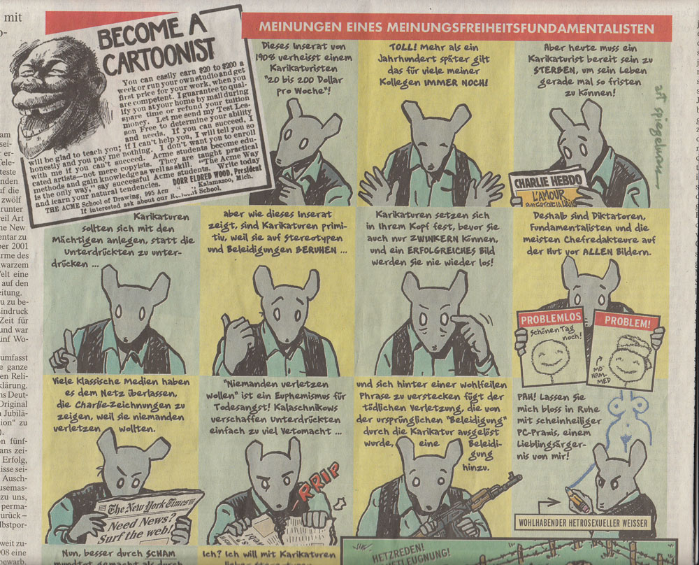 Meine erste Reaktion nach dem Anschlag war, wie anscheinend bei vielen Kollegen, "jetzt erst recht", was in meinem Fall bedeutet, überhaupt auch mal politisch zu werden, denn das sind meine Comics oft eher nur unterschwellig. Die Gefahr ist tatsächlich weniger, dass irgendein verblendeter Spinner meine Comics sieht und mich umbringt, sondern eher, dass ich sie aus Angst einfach nicht mache (und dan von radikalen verblendeten Donaldisten für eine abschätzige Entenzeichnung verfolgt werde, denn das Problem mit verblendeten Spinnern ist nicht, dass sie ggf. religiös isind, sondern dass sie spinnen, man weiß also nie, wofür man am Ende ans Kreuz genagelt wird). Oder, gesellschaftlich betrachtet: dass wir alle zurückschrecken und gewisse Sachen gar nicht mehr sagen, oder nur noch so selten, dass die wenigen, die es tun, viel bessere Zielscheiben abgeben. Tendenzen zu einem derartigen Duckmäusertum hat es nach den dänischen Cartoons damals schon gegeben, weshalb kaum jemand sie abgedruckt hat. Dagegen haben jetzt alle Zeitungen, die ich gelesen habe, das neue CH-Cover abgedruckt. Immerhin.
