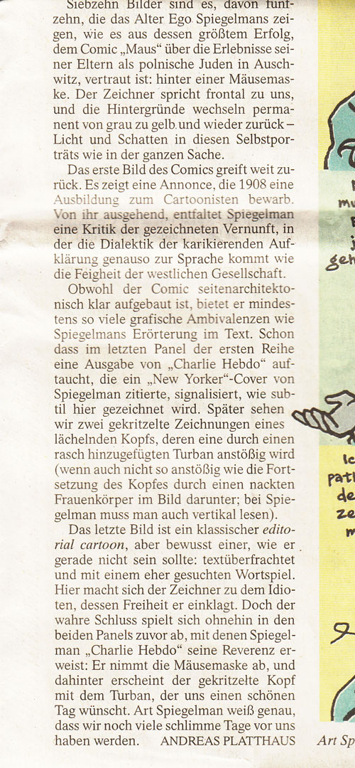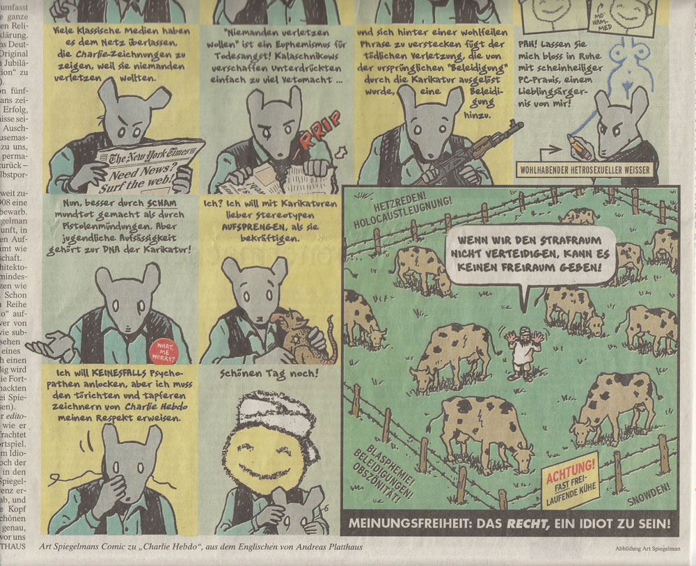 Ein Comic von Art Spiegelman zum Attentat auf Charlie Hebdo findet sich in deutscher Übersetzung in der heutigen Frankfurter Allgemeinen Zeitung. Im Internet habe ich auf Anhieb keine Abbildung gefunden. Gibt's dann sicher demnächst auf der Website der FAZ. Beim hastigen Rumsuchen fand ich aber das hier: