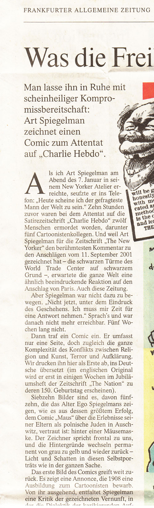 Das hier war also am 21.2. im Feuilleton der FAZ zu lesen: der Comic von Art Spiegelman (oberen und unteren Teil bitte selbst zusammendenken, hatte keine Lust auf Basteleien in Photoshop :whistling: ) Und daneben der Artikel von Andreas Platthaus dazu. Die Überschrift lautet übrigens: "Was die Freiheit der Karikatur bedeutet"