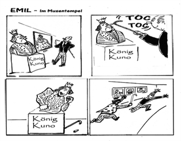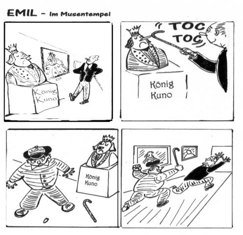 Die Kernidee habe ich aber wohl leider nicht mitgekriegt, weil das bild so klein ist. Emil schlägt der Königsbüste versehentlich etwas ab - die Nase vielleicht - und wird deshalb vom Museumswärter verfolgt. Ungefähr richtig?