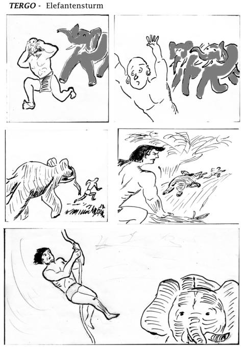Dass er einen Tarzan-Comic machen will, hat Arno doch gar nicht gesagt, sondern einen Dschungelcomic. Hatte nicht z.B. auch Hansrudi Wäscher einen Dschungelhelden? Da kommt man doch auch nicht gleich mit Hogharth oder Raymond als Vergleich :huh: , bzw. Wäschers Fans würde es wohl nicht besonders interessieren. Ich glaube Arnos Umgang mit so einem Abenteuer-Genre ist auch eher humoristisch, da passt das schon ganz gut. Die Elefanten könnten etwas mehr nach Elefanten aussehen, aber das wird schon. Was mich mehr stört, sind die im Nichts verschwindenden Bildrahmen, und dass die Elefanten in der oberen Bildreihe flächig grau gefüllt sind, danach dann aber nur noch mit Schraffuren. Mittendrin das Stilmittel wechseln, ohne dass es eine Logik hat, wirkt, als schere sich der Künstler nicht um den Gesamteindruck.