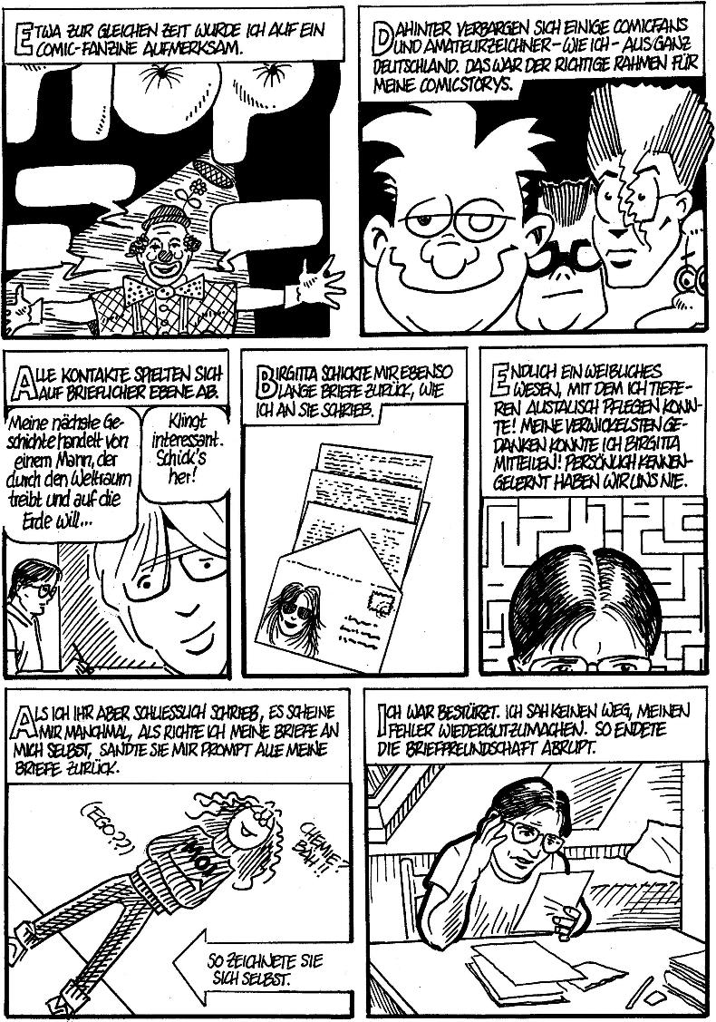 Ich erwarte aber keine Beweihräucherung. Es gibt in meinem Comic zwei grafische "Abteilungen": die selbst erlebten Dinge und die Zitate aus Filmen, Comics und so weiter. Da denke ich schon, daß mir das Nachzeichnen und Zitieren besser gelingt als die eigenen Bilder. Aber - keine Ahnung, wie Ihr das seht.Benutzer, die sich für diesen Beitrag bedankt haben: