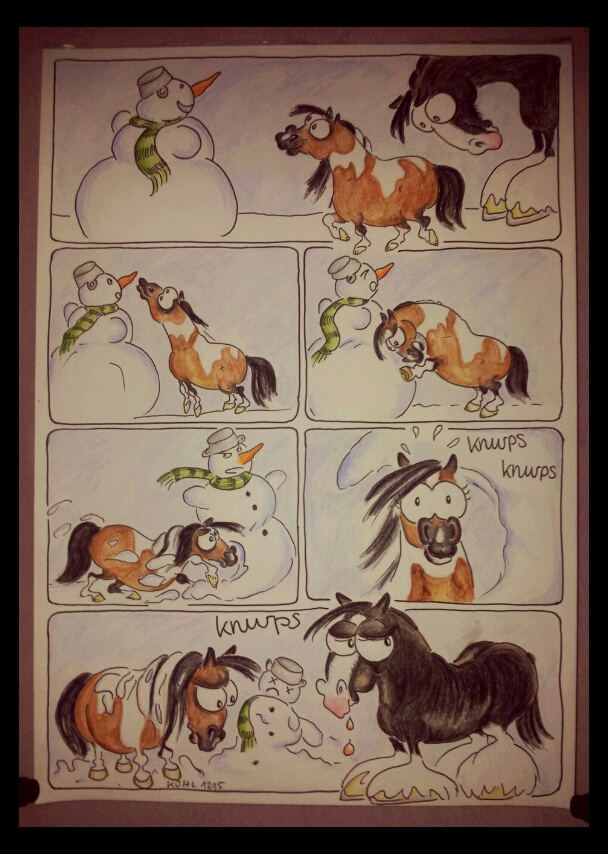 Den Schluß hätte ich etwas anders inszeniert. Im vorletzten Panel müßte man deutlich sehen, wie der Schneemann umkippt. Und das letzte Panel würde ich nochmal zweiteilen. Ein Bild, wo das kleine Pony nach der Möhre sucht und sich nicht erklären kann, wo sie abgeblieben ist. Dann ein zweites Panel mit dem kauenden großen Pony (oder Pferd).So, wie Du es gezeichnet hast, war mir nicht sofort klar, daß der Schneemann umgeworfen wird.
