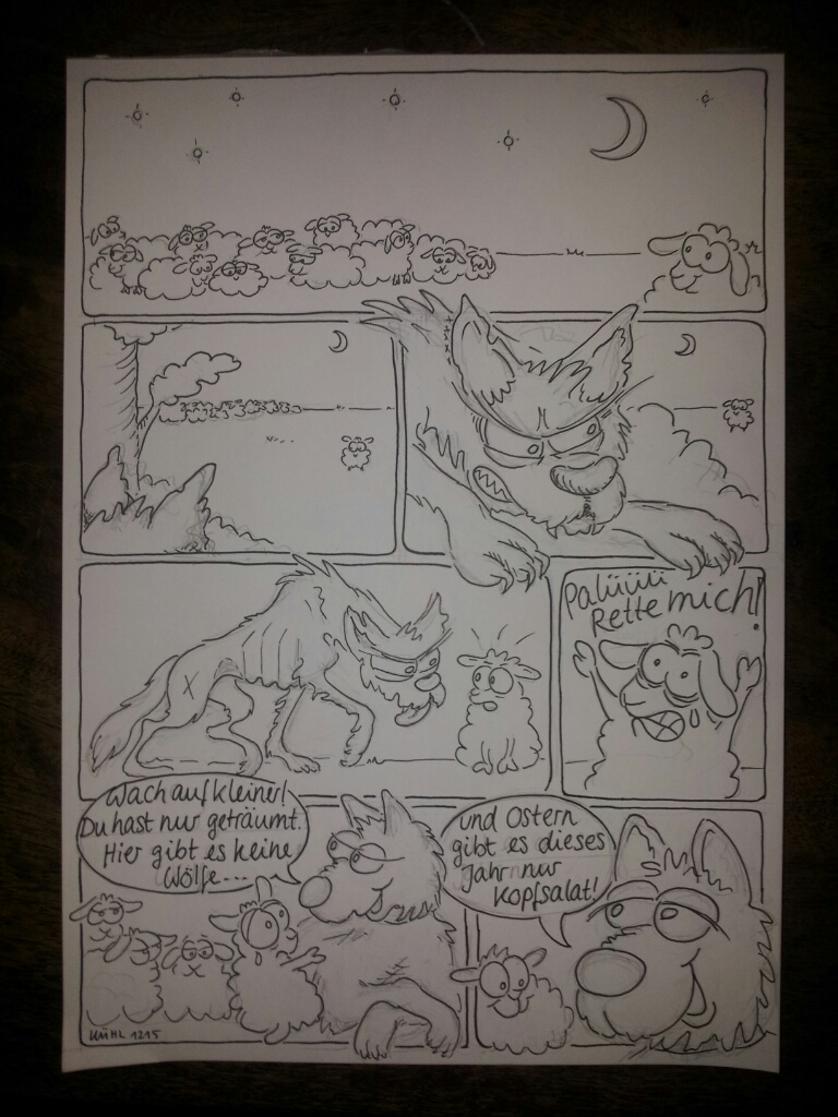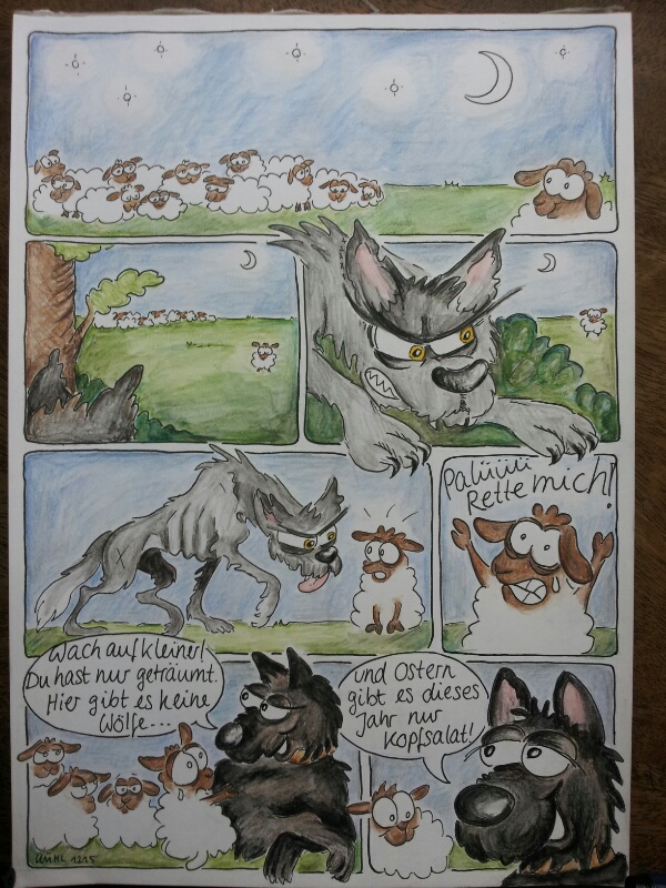 Also abgesehen davon, daß Du Wolf und Hund etwas differenzierter hättest darstellen können, finde ich auch diesen Comic sehr gelungen.