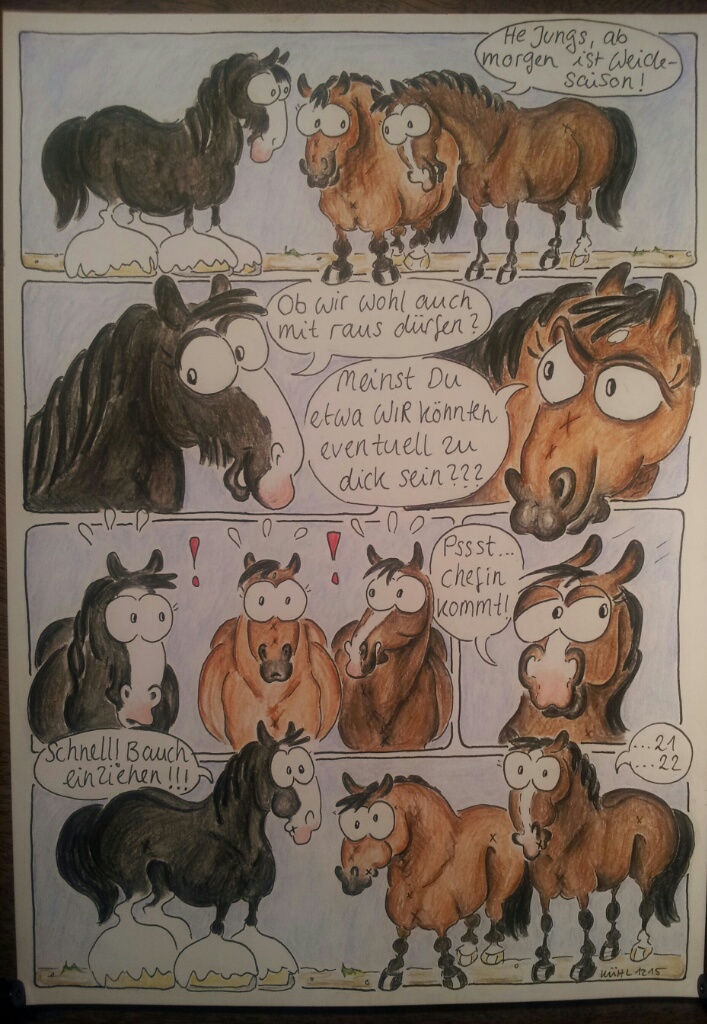 Naja, diese Comics sind schon etwas insiderhaft. Als Nicht-Reiter komme ich da nicht ganz mit. Beim mittleren Comic habe ich gedacht: Wenn die Pferde zu dick sein sollten, wäre doch etwas Auslauf auf der Weide genau das Richtige...
