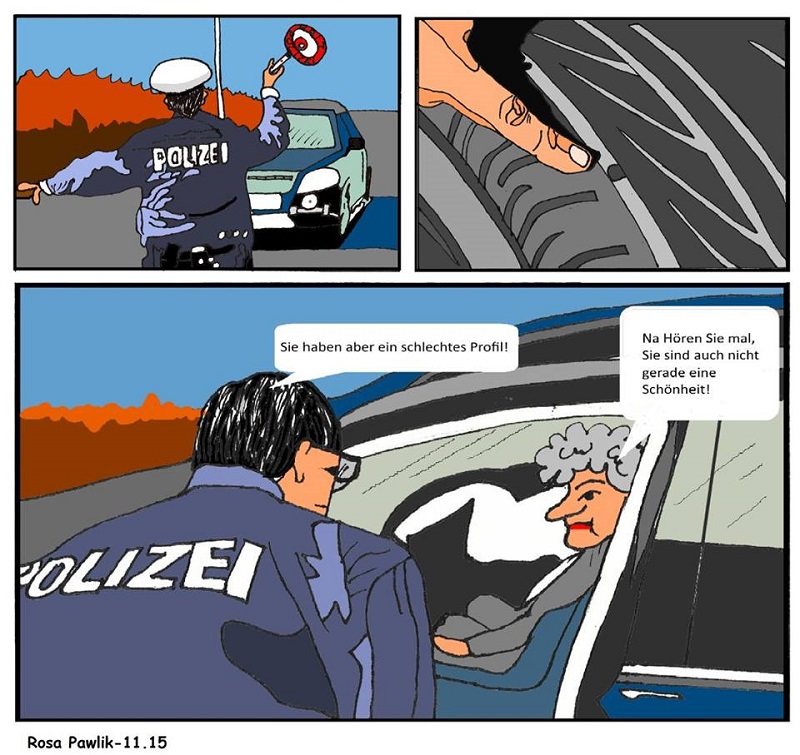 Schon mal drüber nachgedacht anstatt drei Panels nur eins zu nutzen? Wäre meiner Meinung nach hier vorteilhaft (Also z.B Polizist kniend am Reifen des Autos, wenn man die Sprechblasen beibehält funktioniert der Witz genauso. )