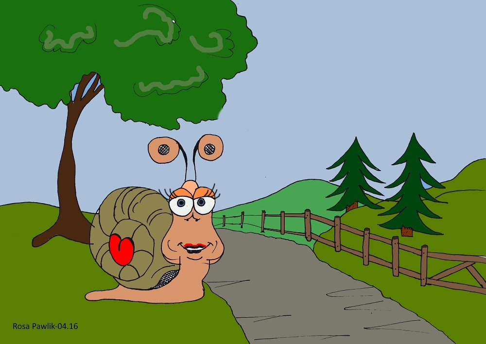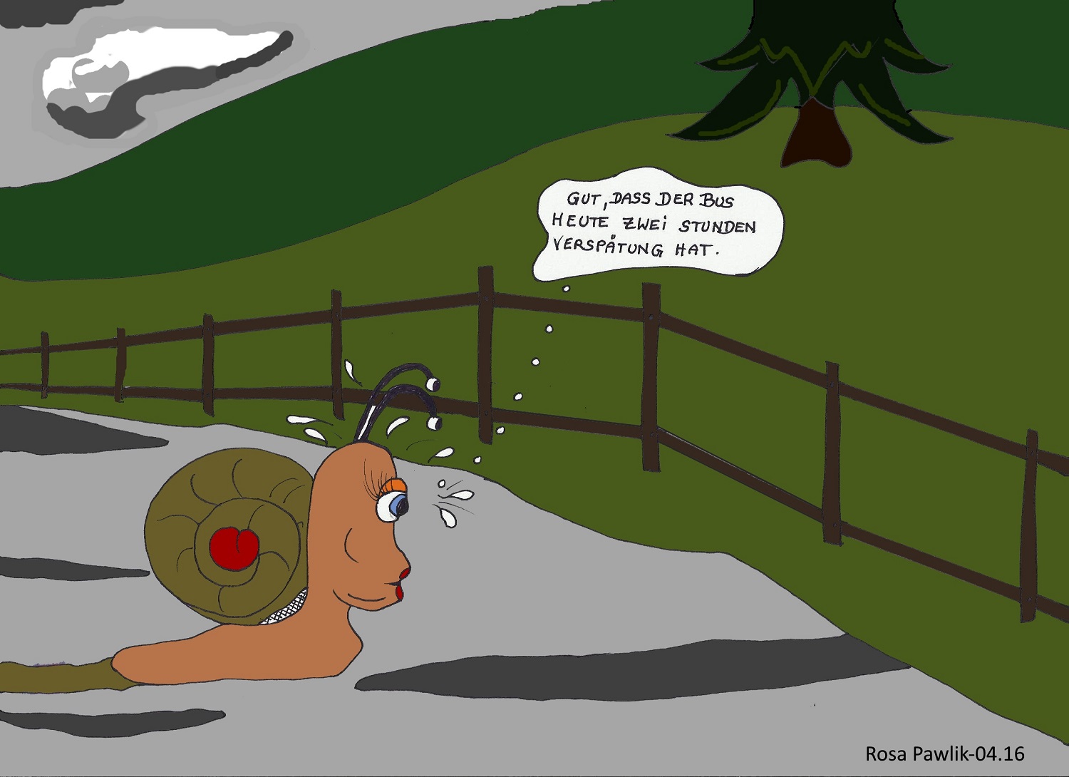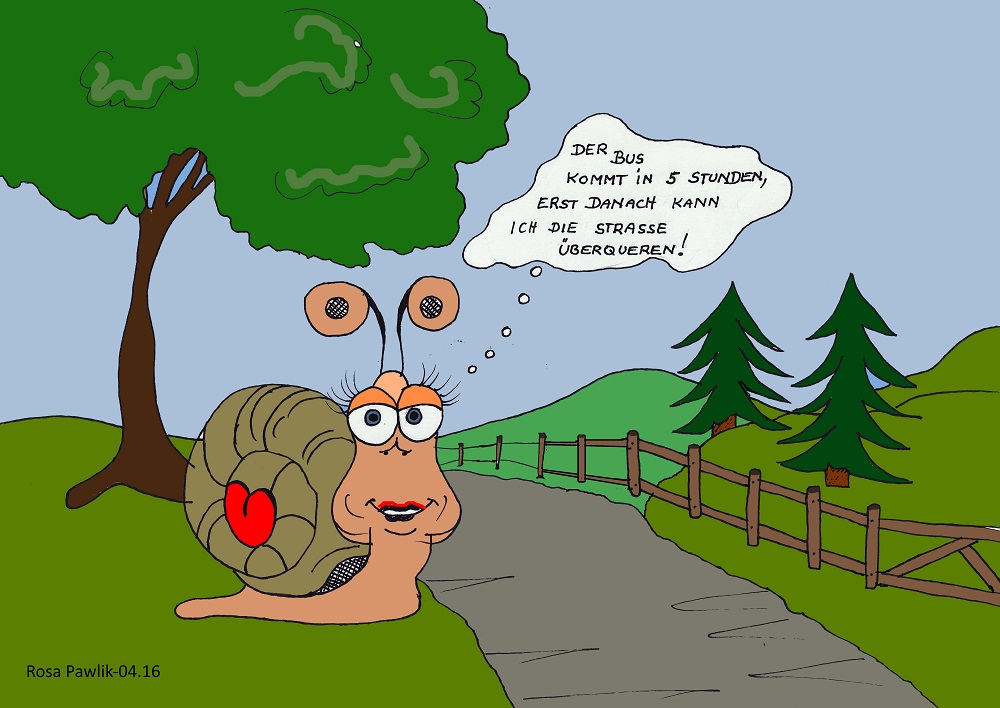 Oder wenn ich auf Dein Motiv Bezug nehme: Zeichne drei Bilder - einmal ist die Schnecke auf der linken Straßenseite, einmal mitten auf der Straße und einmal rechts. Da denkt sie: "Gut, daß der Bus heute zwei Stunden Verspätung hat." Man sieht also, daß sie ungefähr zwei Stunden lang über die Straße gekrochen ist - nur als Beispiel.