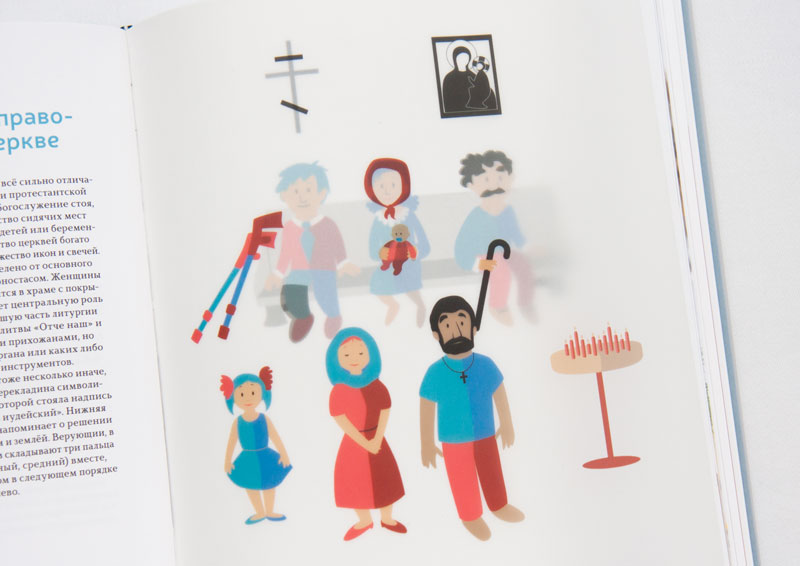 Zusätzlich habe ich einige Transparentpapierseiten gestaltet, die immer eine Illustration im Hintergrund (auf "normalem" Papier) erweitern. Und zwar wird durch das Ergänzen entweder eine "russischen Situation" zu einer deutschen oder andersrum.