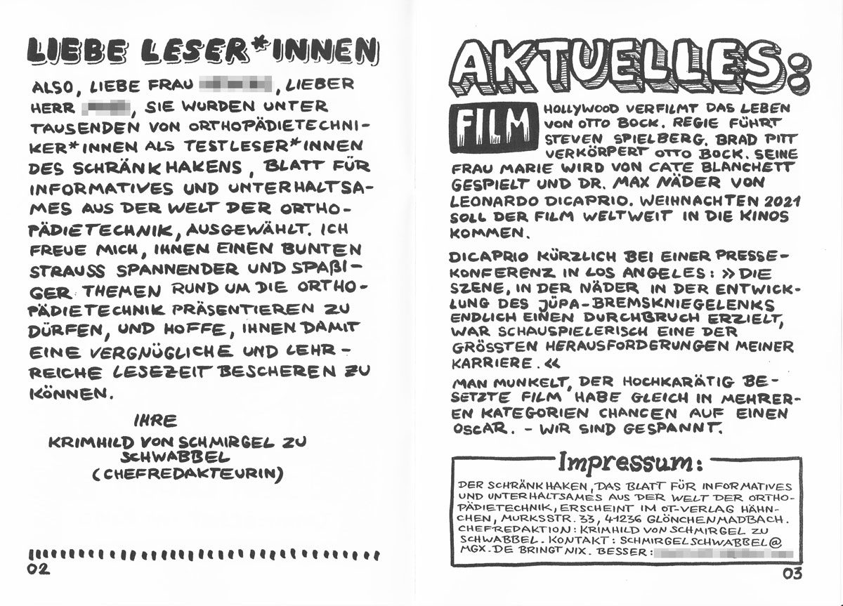 Das ist das Cover einer 12-seitigen Blödelzeitung - MAD lässt grüßen - für zwei längerfristig erkrankte Kolleg*innen, die gefüllt ist mit ein bisschen Quatsch für Orthopädietechniker*innen (und einem ernsthaften Artikel über Albrecht Ludwig Berblinger, besser bekannt als Schneider von Ulm, der nicht nur gescheiterte Flugversuche vorzuweisen hat, sondern schon 1808 eine sehr brauchbare mechanische Beinprothese mit Kniegelenk konstruiert hat.) Die beiden Kolleg*innen haben noch einige Monate mit sehr anstrengenden Therapiephasen vor sich. So ein Heftchen taugt natürlich nicht zum "Aufheitern", sondern nur als Gruß zwischendurch. Für zwei weitere Ausgaben kann ich sicher Material zusammenstellen. Meine anderen Kolleg*innen finden auch Spaß an der Sache und die eine oder der andere haben Talent zum Unsinn. Gute Aussichten also für das "Projekt".