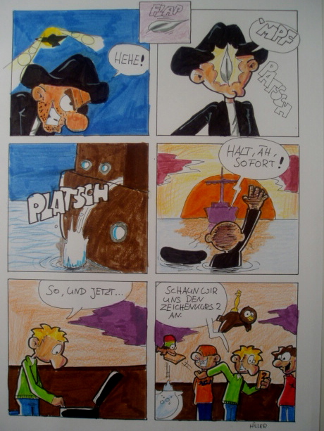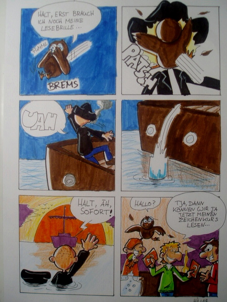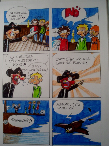 Sehr Dynamisch und Actionreich. Aber mir fehlt ein Panel, wo genauer gezeigt wird wie der Pirat über Bord geht. Das mit der Feder finde ich nicht ganz so gut. Uhu hätte Ihm ja im Sturzflug die Mütze klauen könne, dann hätte er sein Gleichgewicht verloren und wäre abgeschmiert.