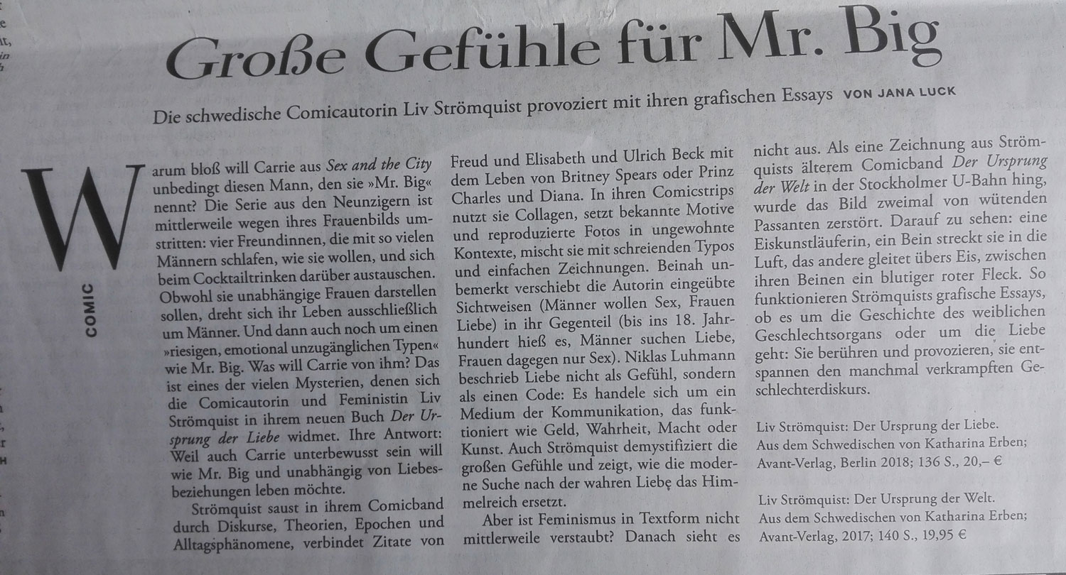 Die Zeit vom 19. Juli 2018 über "Der Ursprung der Welt" und "Der Ursprung der Liebe" von Liv Strömquist und ver.di publik 5/2018 über "Die Welt der Söhne" von Gipi und "Blad" von Regina Hofer.