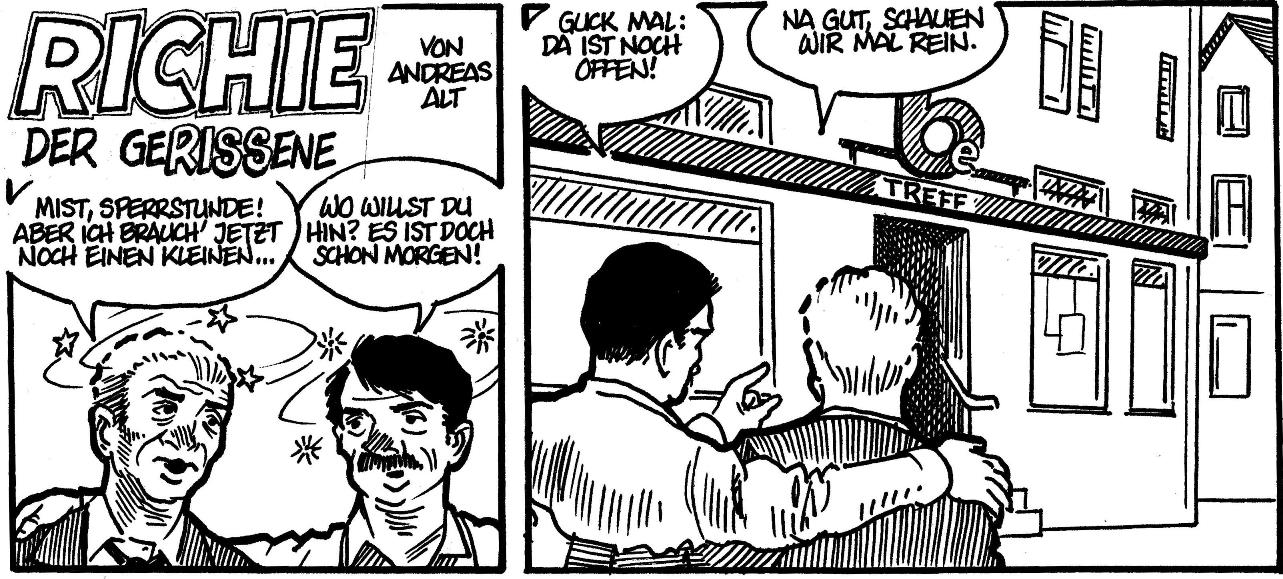 Die Story kann man als Außenstehender wahrscheinlich nicht verstehen. Der "be-Treff" ist eine Süchtigenstube. Sie mußte an einem Platz eingerichtet wurde, der als Treffpunkt von solchen Leuten so langsam problematisch wurde. Jetzt sitzen sie meistens im Treff, und Frauen können den Platz wieder ohne schlechte Gefühle überqueren. Der Ordnungsreferent sagte neulich mal: "Der be-Treff ist doch eigentlich auch nichts anderes als die Eckkneipe früher." Und ich dachte: Das ist doch das Stichwort für eine "Richie"-Story.