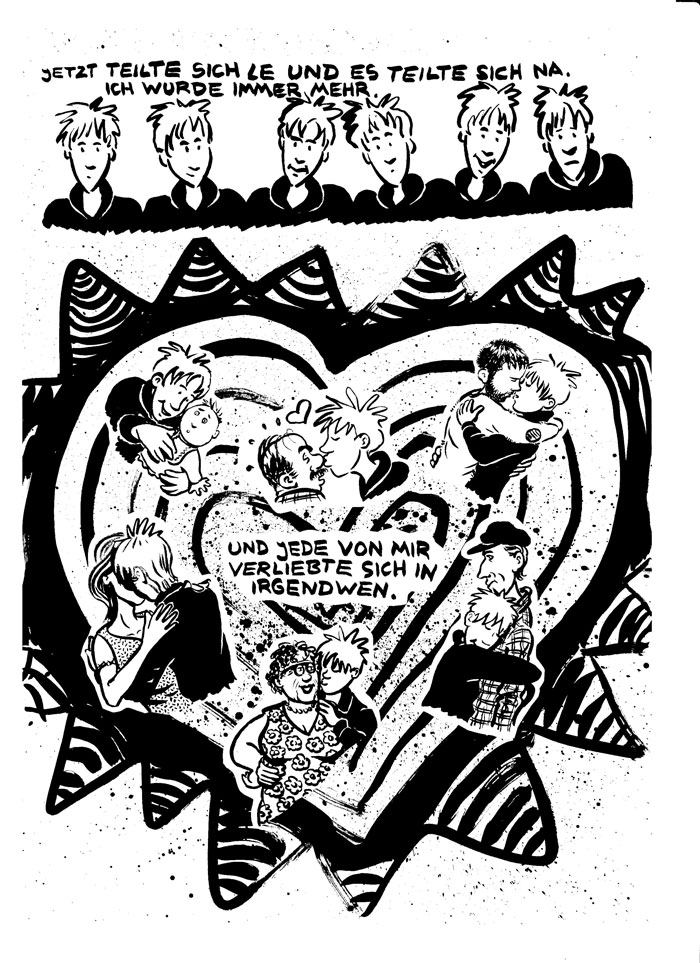 Die Ausgangslage war genau das, was ich da am Anfang beschreibe. Bin jetzt nicht so die Herzensbrecherin. Das ist mir so einmal im Leben passiert. Meine Sicht auf die Situation wurde auch dadurch beeinflusst, dass ich mich damals auf einem „ganzheitlich spirituellen Weg“ wähnte, und dazu gehört wohl, dass man allem, was einem passiert, irgendeinen höheren Sinn, irgendeine Beziehung zu etwas Größerem oder einfach nur Ausuferndem geben möchte. Aber so ein „höherer“ Sinn war da nicht. Ich wollte einfach Erfahrungen machen und keine Entscheidung treffen müssen. Besser gesagt, ich habe mich dafür entschieden, es einfach laufen zu lassen, obwohl ich schon Schiss hatte, am Ende beide Frauen zu verlieren. Nach ca. 2 Jahren war ich auch wieder allein. Der Comic ist aber entstanden, als ich noch mitten in dem völlig neuen, mächtig bedrohlichen Liebes- und Eifersuchtschaos steckte. Naja, und wenn man dann die große Sehnsucht nach Einheitserfahrung (also auch die, dass mal alle Einzelerfahrungen und menschlichen Beziehungen im Leben aufeinander bezogen sind) und das Gefühl, eher so in verschiedene Richtungen auseinanderzudriften, in einen Comic packen möchte, kommt z.B. so etwas dabei heraus.