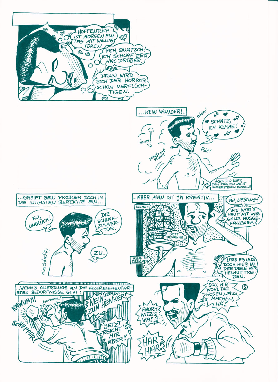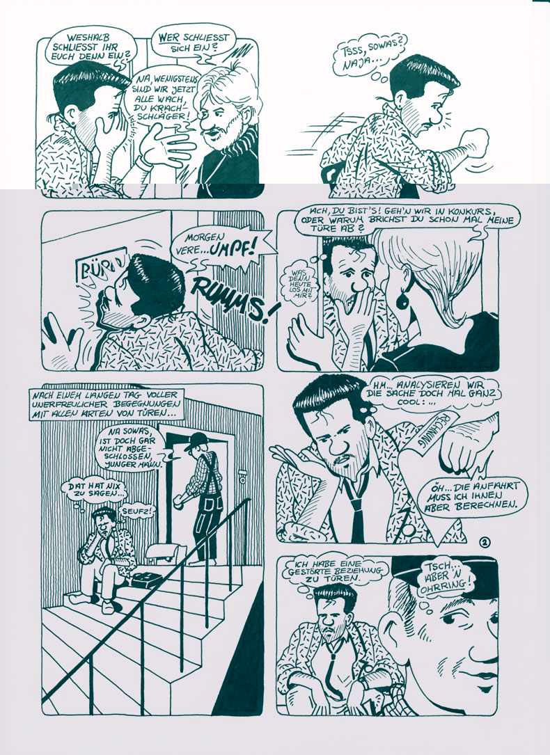 Die Story-Idee so ein bisschen was leichtfüßig Kafka-/Gogol-mäßiges, gefällt mir!Das muss aus den späten 80ern sein. Es geht um Hartmut, der in einer Werbeagentur arbeitet. Eines Morgens wacht er auf und kommt durch keine Tür mehr.
