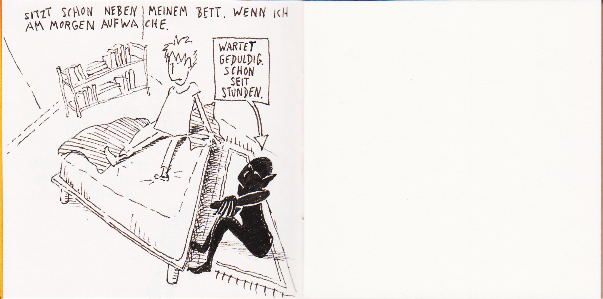 Erinnert mich an die Beschreibung von Depression als schwarzer Hund, der einem überhall hin folgt.Hatte mir ein sehr kleines quadratisches Skizzenheft zugelegt. Aber über Depressionen zu zeichnen hat mir gar nicht gut getan. Also war schon nach zwei Bildchen Schluss. Die Zeichnungen finde ich aber ganz schön.
