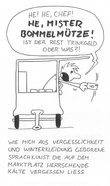 Manchmal glaube ich echt, man muss sich gar nichts ausdenken, sondern einfach nur den Leuten zuhören ;) :D Der betreffende Kunde ist übrigens bei "Bommelmütze" tatsächlich zurückgegangen und hat sich sein Wechselgeld geben lassen - entweder hat ihn die Mütze oder die Lautstärke drauf gebracht :D :D