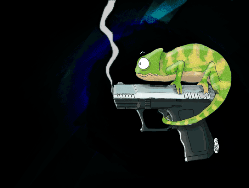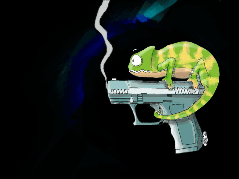 Die Idee mit einem Chamäleon auf einer abgeschossenen Waffe, hab ich irgendwo mal aufgeschnappt. Die Idee hat mir so gut gefallen, dass ich sie selbst nochmal umgesetzt habe.