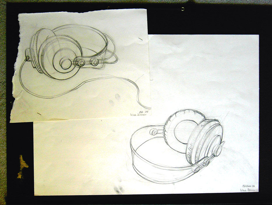 Bei der ersten Aufgabe, sah das Stillleben, das wir abzeichnen sollten so aus: Ein großer Tisch, ein paar Stühle kreuz und quer darum, ein Einkaufswagen mit zwei großen Papprollen und viiiiiel, viiiiiiiiiiel (noch mehr!) zeknülltes Papier (so ganz langes/breites) auf den Stühlen und dem Tisch drapiert. Die Zeit für die ersten Aufgaben war echt richtig heftig! Für die Bleistiftzeichnungen gerade mal 15 Minuten pro Blatt, da bleibt keine Zeit um großartig nachzudenken oder Fluchtpunke zu planen. Einfach alles durchziehen auch wenn es vor Fehlern nur so strotzt!