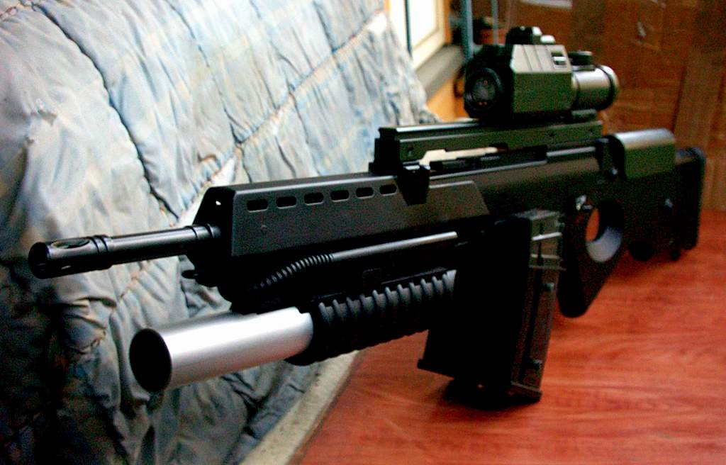 Es gibt auch Kombiwaffen - d. h., daß diese (meistens) Sturmgewehre einen Granatwerfer oder eine kurze Schrotflinte unter ihrem eigentlichen Lauf aufweisen - wodurch sie ziemlich beeindruckende Ausmaße annehmen können (siehe Beispielbilder ganz unten aus unserer Requisite). Das berühmteste ist die sogenannte MASTERKEY-Konfiguration. Ein M-16 oder M-4 mit einer kurzen Pump Gun unter dem Lauf, mit der Flintenlaufgeschosse verwendet werden, um möglichst schnell handelsübliche verschlossene Türen aufzubekommen (Masterkey = Generalschlüssel).