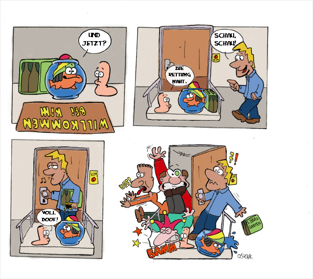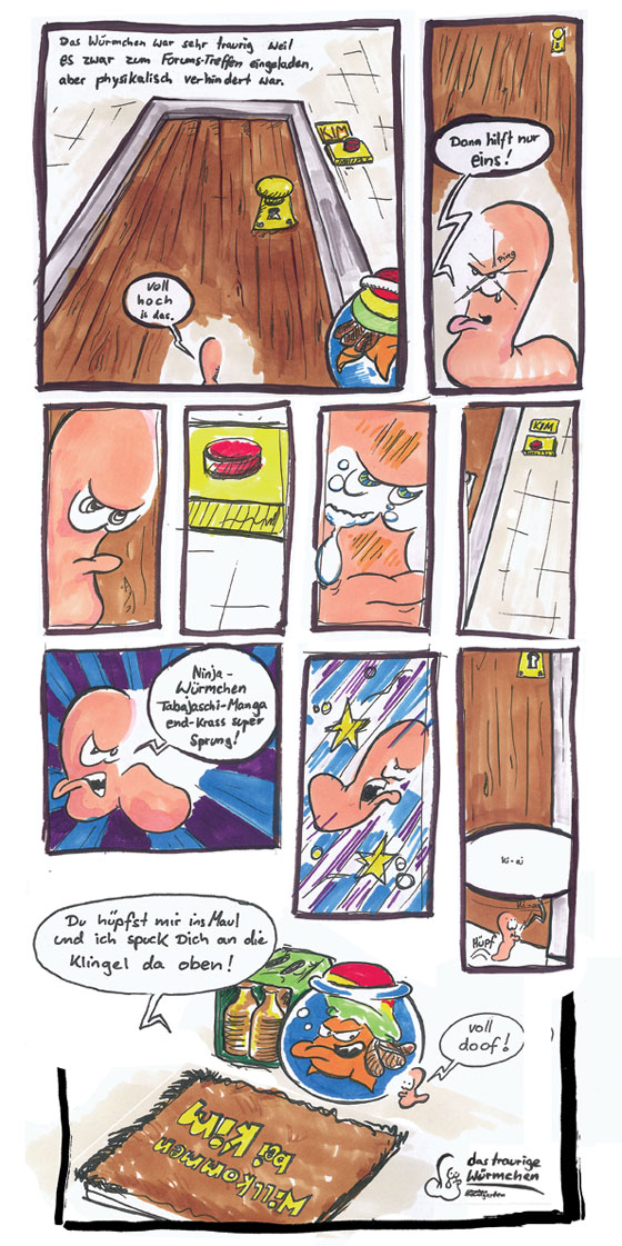 Die Handlung ist schnell erzählt: Da ein Forentreffen mit allen Mitgliedern wahrscheinlich nie realisiert werden kann, muss es halt in Comicform stattfinden. Die Geschichte beginnt bei Kim zuhause, bei dem nach und nach immer mehr Leute auftauchen und eine Party entsteht welche langsam ins Chaotische abgleiten soll. Die Leute die auftauchen sollen natürlich durch uns dargestellt werden. Damit auch jeder im Comic in der Form auftaucht, in der er sich gerne sehen würde, schlage ich vor dass jeder seine eigene Figur selber einführt und alle anderen sich in den folgen Beiträgen nach dieser Vorlage richten. Das bedeutet natürlich auch wieder, dass nur die im Comic auftauchen, die auch einen Beitrag liefern oder wenigstens eine Vorlage für ihre Figur abliefern.